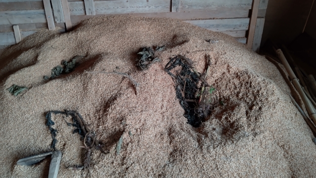 直射日光が当たらない倉庫の中で「もみ殻」の中に入れてます。来年用というか今年使う種イモは確保できたのでまぁいいかな。