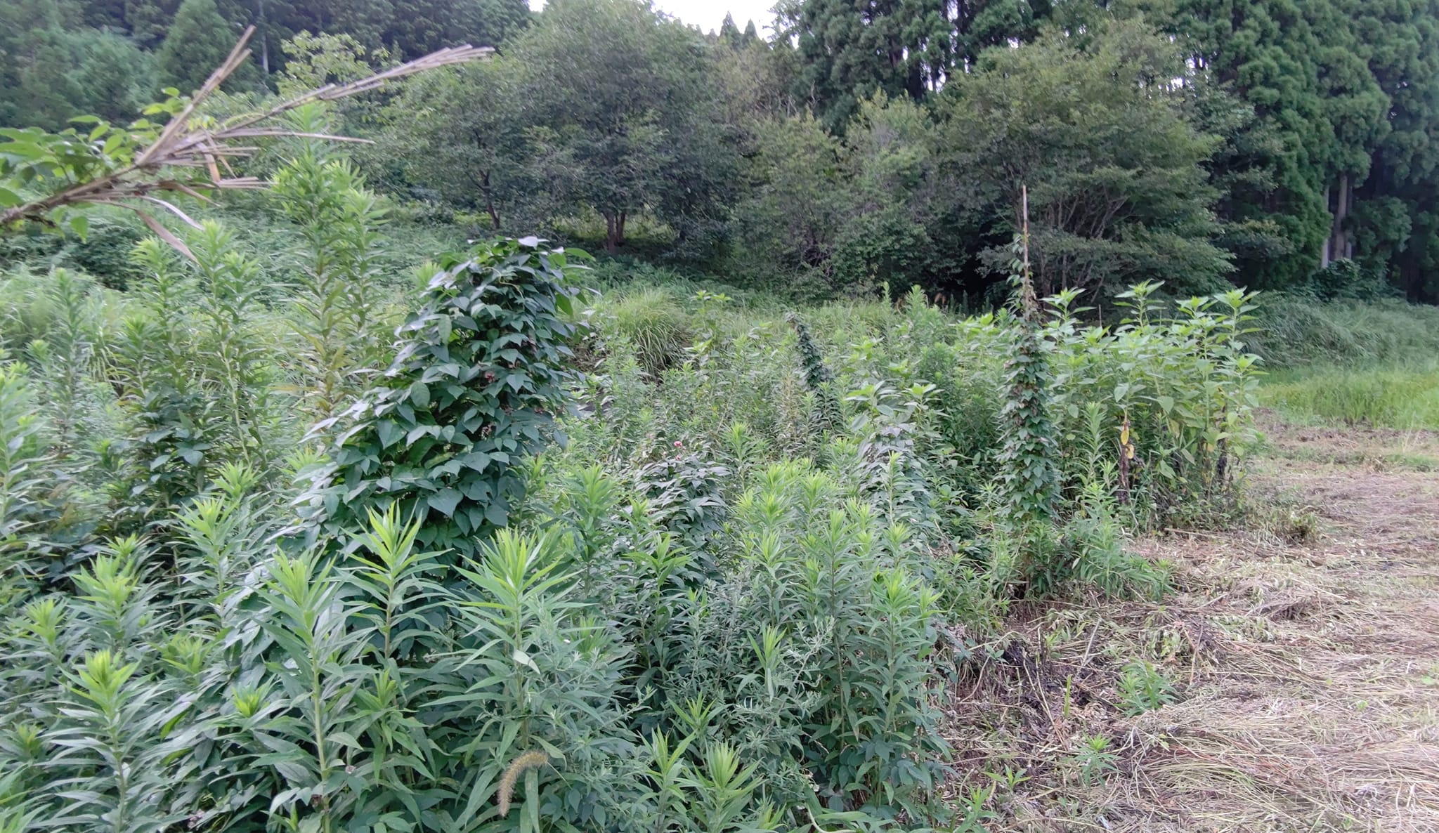 キクイモの隣はアピオスです。アピオスは灰汁(あく)が強いのでイノシシは食べません。だから畑は無傷です。収益を考えたらアピオスの方がいいかも。10アールあたり30万円以上見込めるので。