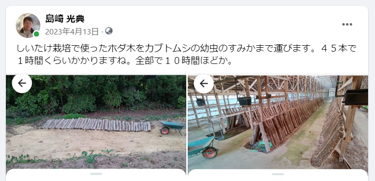 2023年4月15日 / 最終更新日時 : 2024年5月25日 shimasakimitsunori Facebook 一昨日から、しいたけ栽培で使ったホダ木をカブトムシの幼虫のすみかにするために一輪車で運んでました-2023-04-15 全部で461本あった。 雨が降ってくる前になんとか終わらせた。 この次はもみがらと刈草を交互に積み上げて堆肥になるようにします。 FacebookXBlueskyHatenaCopy コメントを残す コメントをキャンセルメールアドレスが公開されることはありません。 ※ が付いている欄は必須項目ですコメント ※ 名前 ※ メール ※ サイト 次回のコメントで使用するためブラウザーに自分の名前、メールアドレス、サイトを保存する。 上に表示された文字を入力してください。 Δ