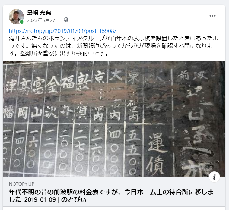 滝井さんたちのボランティアグループが百年木の表示杭を設置したときはあったようです。無くなったのは、新聞報道があってから私が現場を確認する間になります。盗難届を警察に出すか検討中です。