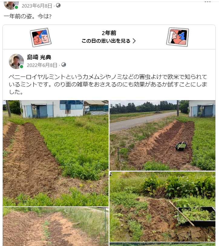 2023年6月8日 / 最終更新日時 : 2024年5月25日 shimasakimitsunori Facebook 一年前の姿。今は?-2023-06-08 ペニーロイヤルミントというカメムシやノミなどの害虫よけで欧米で知られているミントです。 のり面の雑草をおさえるのにも効果があるか試すことにしました。 一年後の姿。ペニーロイヤルミントが増えました FacebookXBlueskyHatenaCopy コメントを残す コメントをキャンセルメールアドレスが公開されることはありません。 ※ が付いている欄は必須項目ですコメント ※ 名前 ※ メール ※ サイト 次回のコメントで使用するためブラウザーに自分の名前、メールアドレス、サイトを保存する。 上に表示された文字を入力してください。 Δ