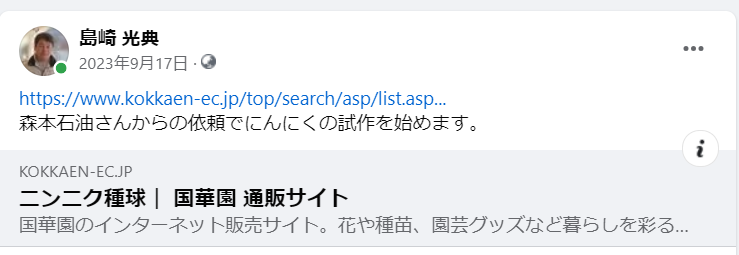 2023年9月17日 / 最終更新日時 : 2024年5月27日 shimasakimitsunori Facebook 森本石油さんからの依頼でにんにくの試作を始めます-2023-09-17 国華園で注文しました 中国産のホワイトにんにくが一番安かった。 産地が江蘇省ピシュウだと品質は問題ありません。 FacebookXBlueskyHatenaCopy コメントを残す コメントをキャンセルメールアドレスが公開されることはありません。 ※ が付いている欄は必須項目ですコメント ※ 名前 ※ メール ※ サイト 次回のコメントで使用するためブラウザーに自分の名前、メールアドレス、サイトを保存する。 上に表示された文字を入力してください。 Δ