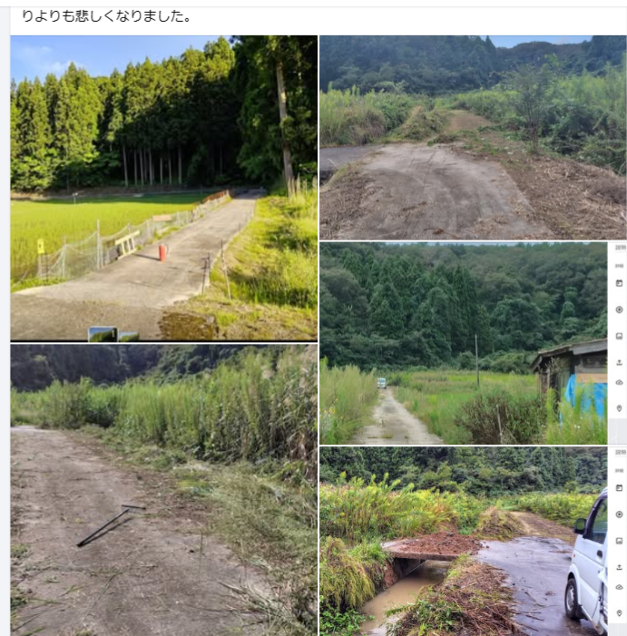 この橋のところは水田だった当時は電気柵で通せんぼしてたんだよ。だから昔から通行していません。今はこの橋の向こう側は全部耕作放棄地です。今年は能登半島地震で警備のシフトが人手不足で元日からほとんど変わっていないので、草刈りする時間が取れていません。9月の大水害の後になってやっとこさ時間が少し取れたので徐々に草刈りしてました。10月2日に何かしているのは目視できましたが、ケンカになると嫌だから近づきませんでした。能登半島は大水害で大変なことになっているのに何をしてるんだか。こんなことをしなくてもこの橋は通行しませんよ。怒りよりも悲しくなりました。
