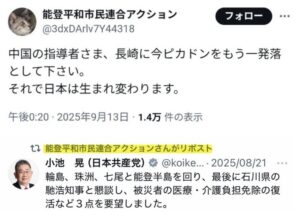 2026年2月26日 / 最終更新日時 : 2026年2月26日 shimasakimitsunori X(旧ツイッター) なんだか変なものが沸いてる-2025-09-15 なんだか変なものが沸いてる。削除されたアカウントだけど全部同じです。別でまだいるけど。能登半島から発信とかマジでやめてほしい。 pic.twitter.com/EcNT23vOjz— 島崎光典 (@smsk_mtnr) September 15, 2025 なんだか変なものが沸いてる。 削除されたアカウントだけど全部同じです。 別でまだいるけど。 能登半島から発信とかマジでやめてほしい。 FacebookXBlueskyHatenaCopy コメントを残す コメントをキャンセルメールアドレスが公開されることはありません。 ※ が付いている欄は必須項目ですコメント ※ 名前 ※ メール ※ サイト 次回のコメントで使用するためブラウザーに自分の名前、メールアドレス、サイトを保存する。 上に表示された文字を入力してください。 Δ